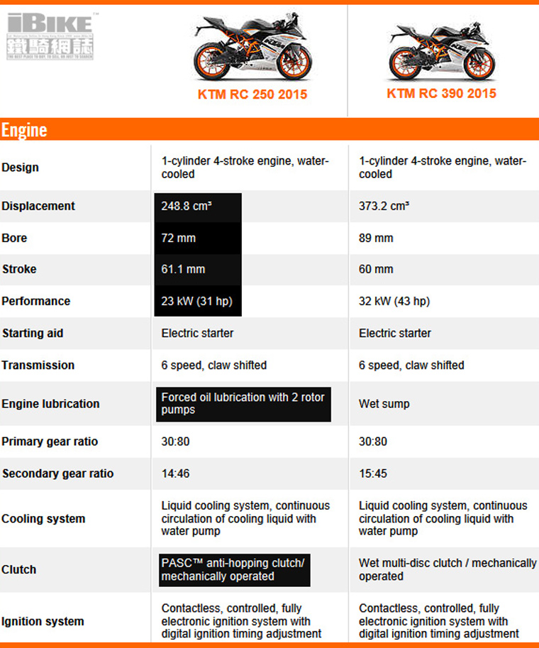 RC 250和RC390的外型完全一樣,排氣量少了,馬力少了,但它仍有賣點。首先是車價較便宜,也較慳油,最主要是油門表現較柔順,沒有RC390咁牛。250的車身震動也較390輕微,所以RC250較舒適和容易操控,更適合新手選用。