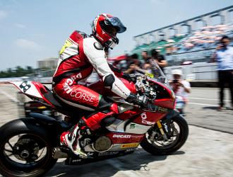 | Alessandro表示 :「 由於上次天氣不穩定的原因,仍未能調好在新車Ducati V4上的設定,而且這次Ohlins 中國總代理提供了全新競技FKR前叉芯,所以希望提早一點來調校好車子。」 |